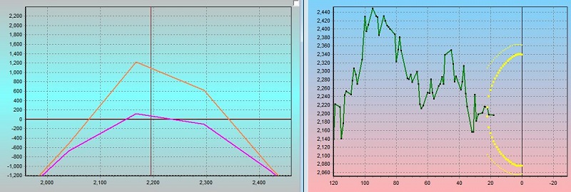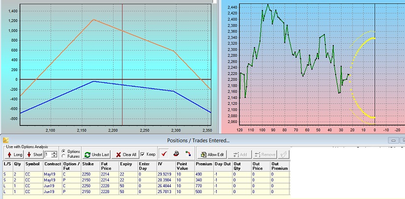 We short two Call options above the market and hedge with a long Call in the Jun options month, then short two Put options below the market and hedge that with a long Put.  Cocoa can take as much time as it likes to decide where it wants to go, but if it stays between 2080 and 2340 for the next 22 days we will make upwards of $600 from its indecisiveness - starting on this weekend where two of those days will expire and the market goes nowhere